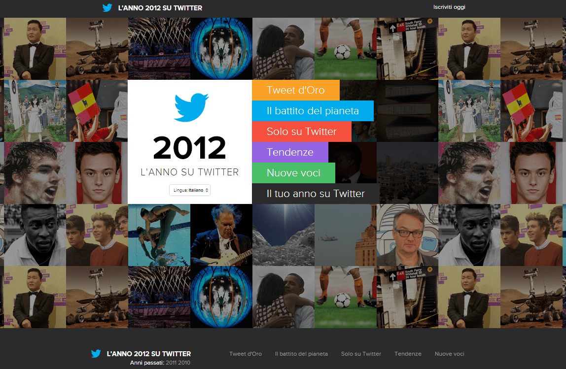Lço ha fatto realizzando un sito in cui vengono ricordati gli eventi più importanti del 2012. E’ suddiviso in sei sezioni: Tweet d’Oro, il battito del pianeta, solo su Twitter, tendenze, nuove voci e il tuo anno su Twitter.