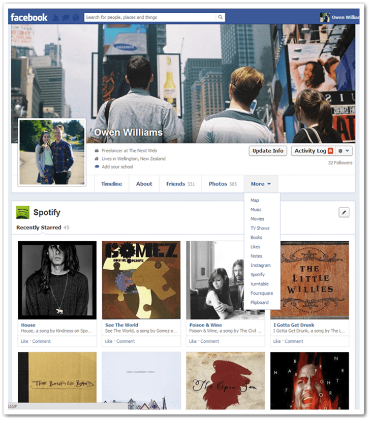 Ci sono novità anche per le sezioni che non compaiono in homepage. Cliccando in alto su More (altro se avete fb in italiano) nel profilo di un utente potrete vedere tutte le pagine che gli sono piaciute divise per argomenti Film, Serie Tv, Musica, Sport ecc c Basterà un’occhiata veloce per conoscere le sue passioni e interessi e farsi un’idea più approfondita della persona in questione.