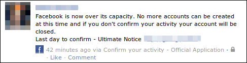 “Facebook è in sovraccarico, conferma subito il tuo account per non essere cancellato” oppure ” oggi è l’ultimo giorno per confermare l’account, altrimenti verrà cancellato domani.