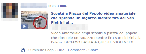 1) sulla bacheca di alcuni utenti compare un messaggio che invita a cliccare per vedere un video, ad es “Scontri a Piazza del Popolo video amatoriale che riprende un ragazzo mentre tira dei San Pietrini alla Polizia. DICIAMO BASTA A QUESTE VIOLENZE“. in genere il vostro contatto che ha condiviso il link è vittima anche lui della truffa.