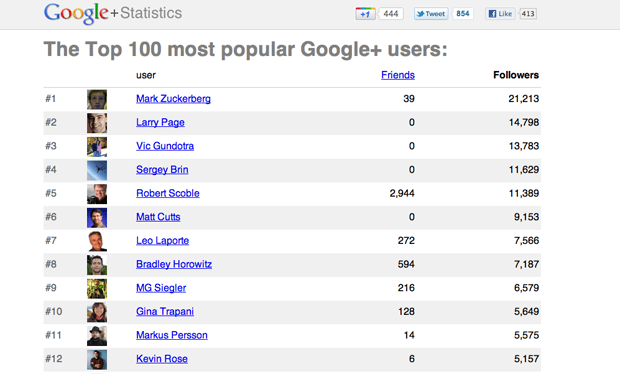 Google ha pubblicato le statistiche del suo nuovo social network. come potete vedere Mark Zucherberg ha più followers perfino di Larry Page, forse perché tutti sono curiosi di conoscere le sue reazioni.