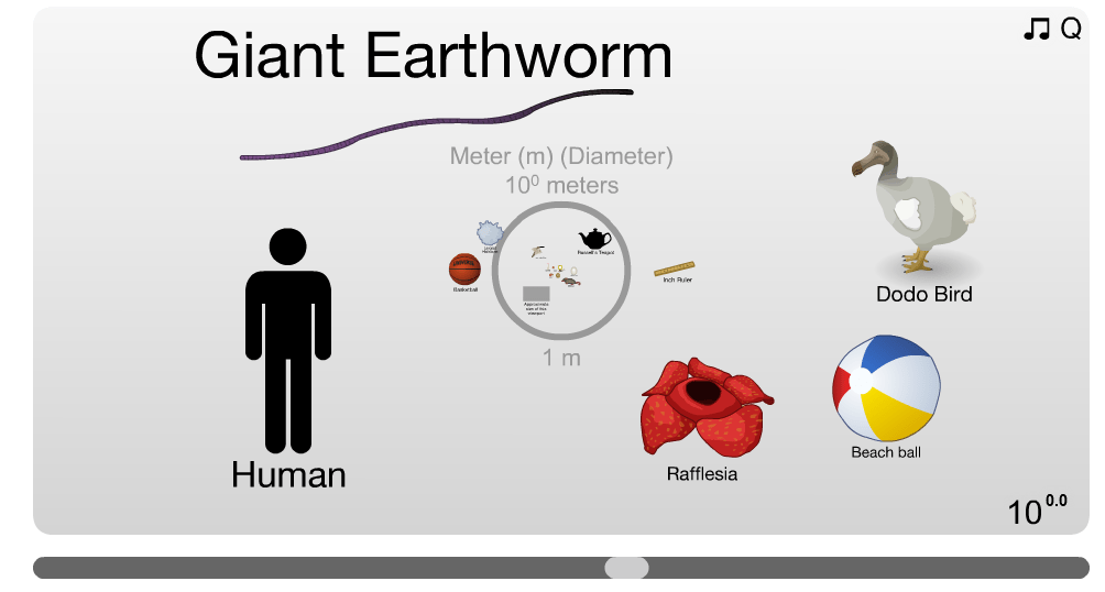 Per iniziare non dovete fare altro che girare la rotellina del mouse avanti e indietro sulla barra di ingrandimento e ogni volta vi comparirà una schermata interattiva con oggetti che vengono confrontati tra loro. In basso a destra troverete le dimensioni e potrete scoprire ad esempio quanto è grande un elefante rispetto ad una balena, o la torre Eiffel paragonata all’Everest o un virus rispetto a una goccia