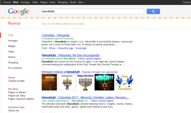 Hanukkah o ‘Festa delle luci’ è una festività ebraica che simboleggia il dominio della luce sull’oscurità e si celebra mediante l’accensione di candele.Anche Google lo fa, scrivete *Hanukkah* e accendete le luci!