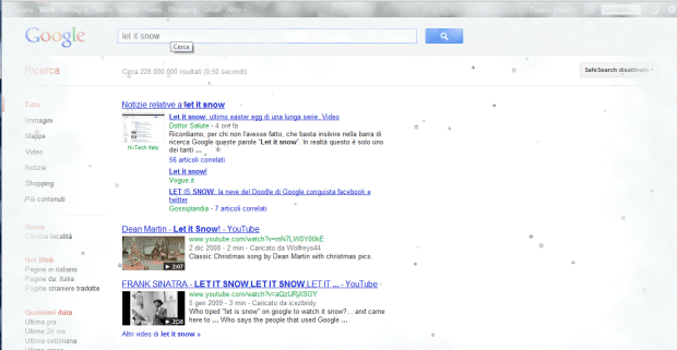 Ha fatto il giro del mondo, pubblicato su milioni di blog e su Facebook e quindi sicuramente l’avrete già visto. Se così non fosse digitate *let it snow* nella barra di ricerca di Google, senza asterischi e come per magia inzierà una splendida nevicata sulla pagina 🙂