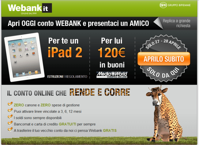 Volete un iPad 2 gratis?Vi basta attivare un conto Webank il 27 o il 28 Aprile ed è fatta.