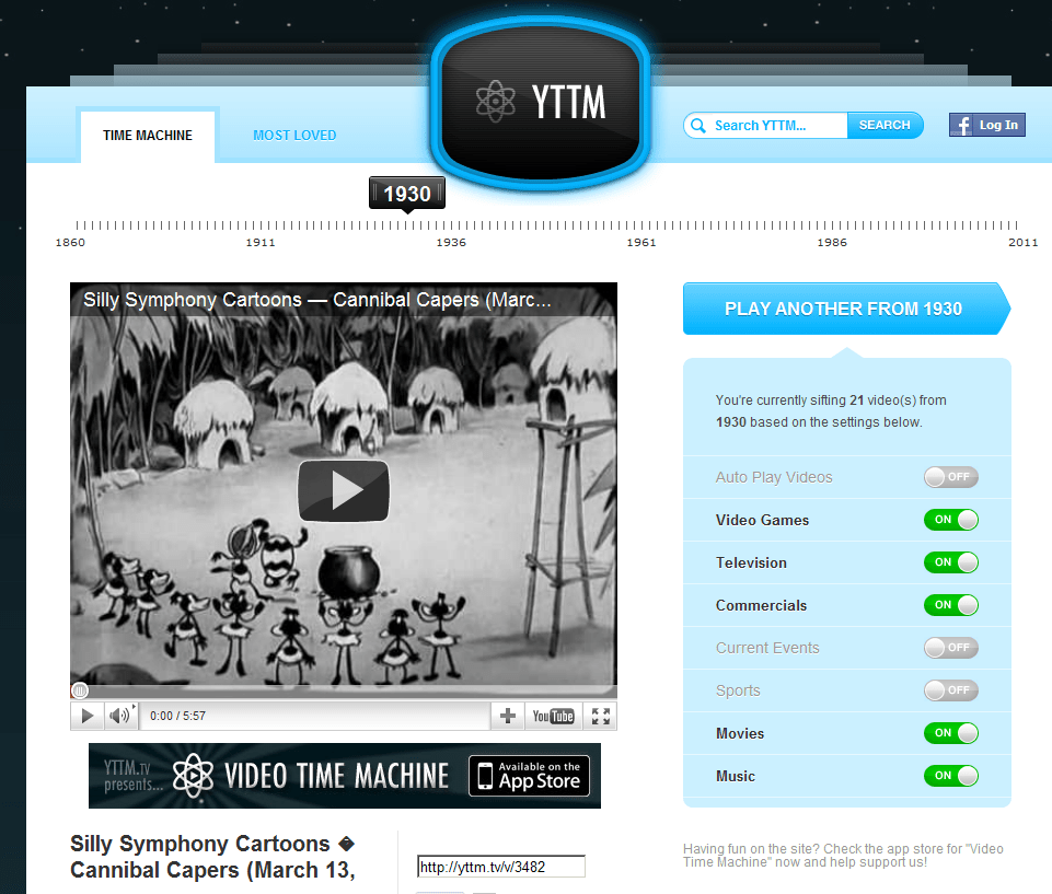 Vi basterà scegliere dalla timeline l’anno in cui desiderate immergervi e poi gustarvi i video che YTTM selezionerà per voi. Potete scegliere una data qualsiasi tra il 1860 ed oggi.
