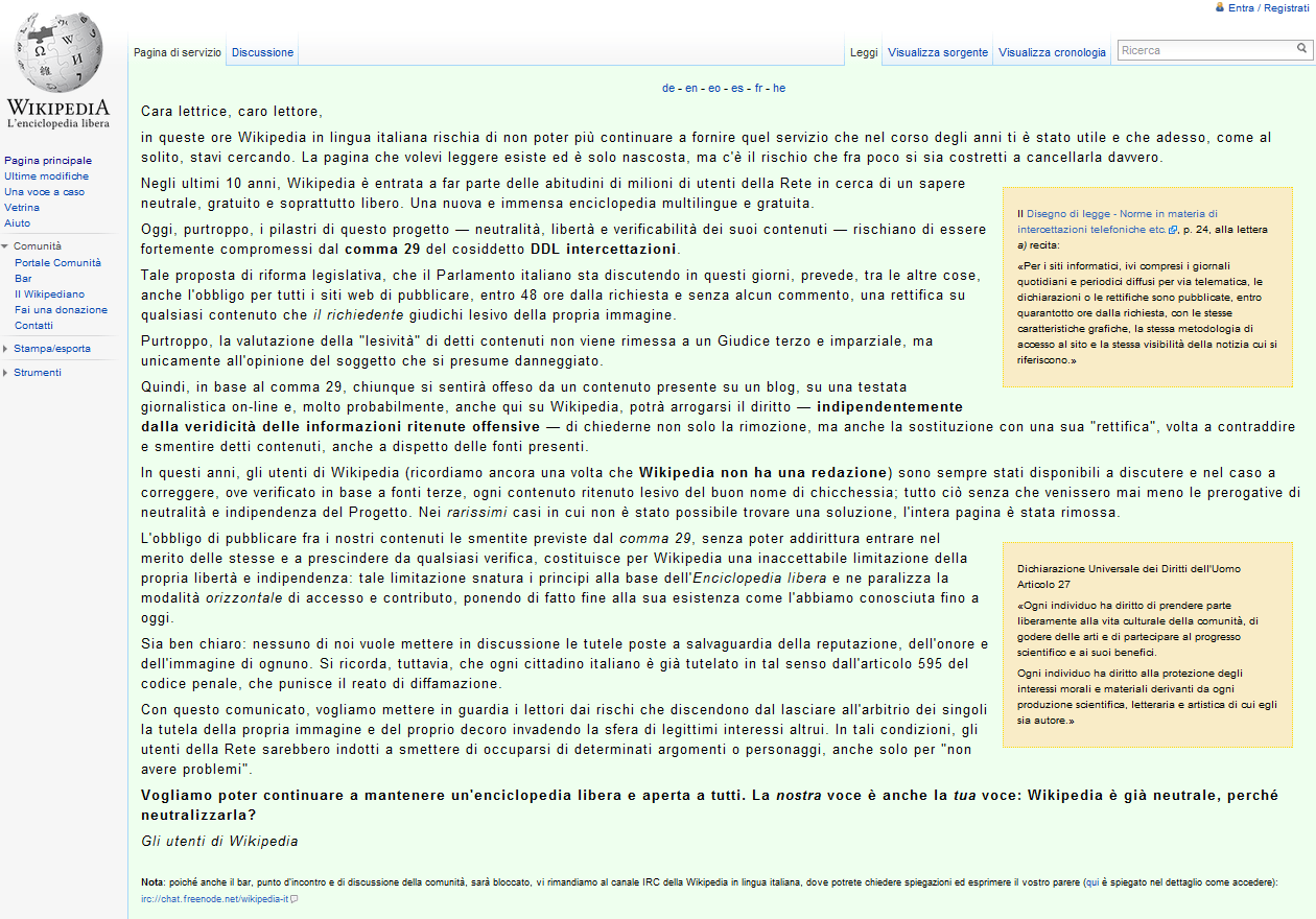 Oggi, purtroppo, i pilastri di questo progetto — neutralità, libertà e verificabilità dei suoi contenuti — rischiano di essere fortemente compromessi dal comma 29 del cosiddetto DDL intercettazioni.